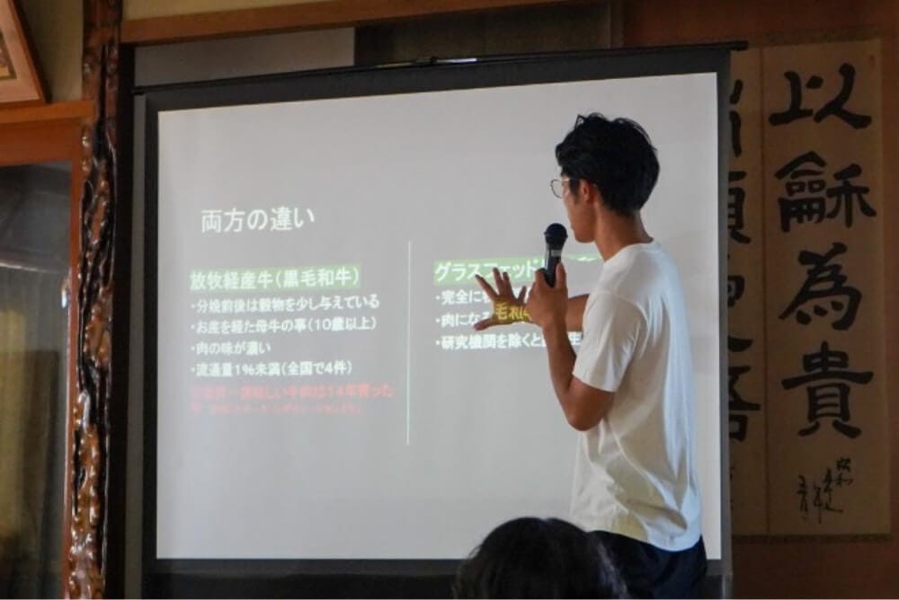 外国の穀物飼料に依存しない牧草で育てる牛肉生産の事と、その牛が放牧されている上の山放牧場での顧客体験を通し、にかほ市でしか見れない美しい自然景色を後世に残したいという熱い思いをもった話をしていただきました。