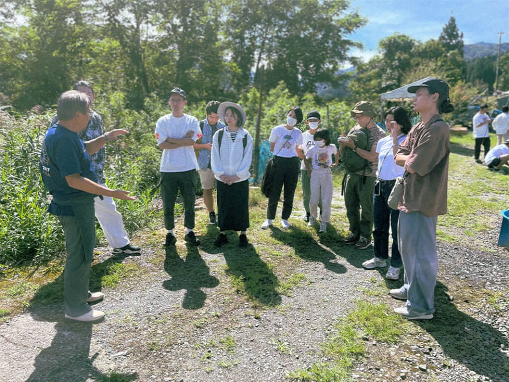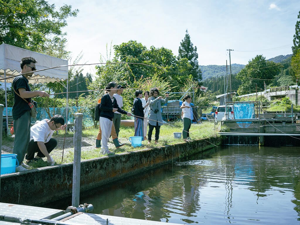 イワナの里では、地元の菊池さんから湯沢市の特徴や課題を拝聴し、その後、イワナ釣り体験やブラインドで周辺の自然を散策するなど全身を使ったフィールドワークを実施しました。