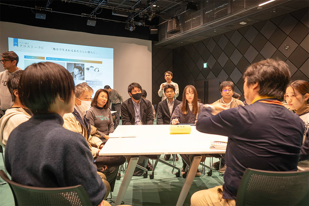 クロストーク第二部では、「まち、データ、ロボットで生みだす未来」「地域起業家を100人つくるためには」「地方で生まれる新しい暮らし」「私たちのまちをつくるとしたらどんなまち?」の4つのテーマを題材に、14名のサポーターが4台のテーブルに分かれ、クロストークとワールドカフェが催されました。