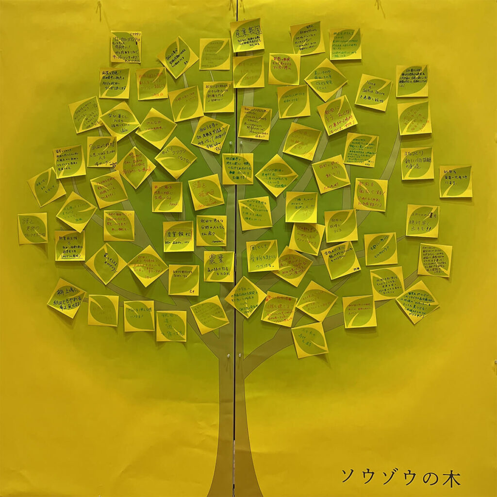 参加者が木の葉形のカードに今年来年にチャレンジしたいことを活動目標というかたちで記入し、会場に設けたソウゾウの木に掲示しました。