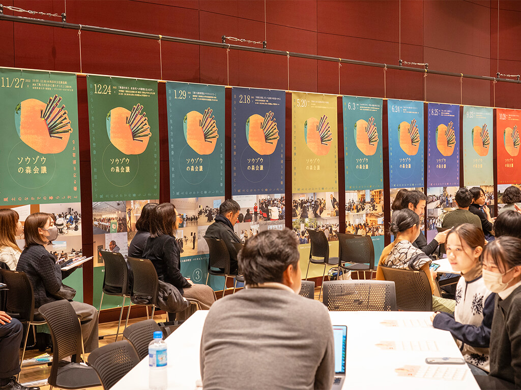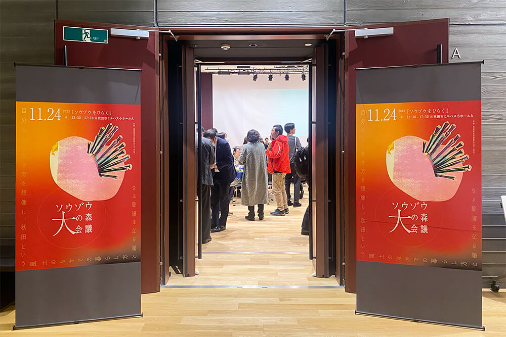 2022年度から大学、市民、企業、行政など地域のステークホルダーが一堂に会し、「ソウゾウの森会議」と題して、豊かな暮らしの具体化と実現のために取り組んだ事業創造の集大成として、令和5年11月24日、あきた芸術劇場ミルハス(秋田市)にて、第1回ソウゾウの森大会議が開催されました。