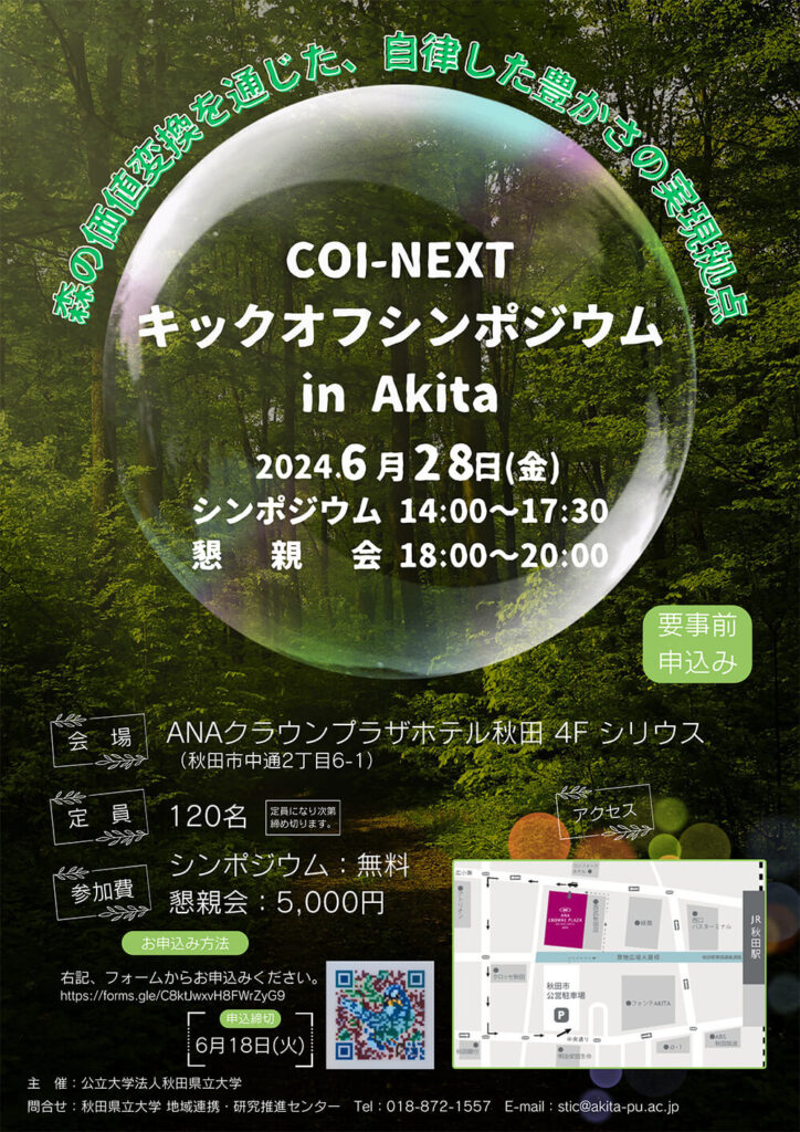 秋田県立大学木材高度加工研究所の高田 克彦 教授・所長がプロジェクトリーダーとなり、秋田県立大学、国際教養大学、秋田公立美術大学の秋田の3つの公立大学が連携する『森の価値変換を通じた、自律した豊かさの実現拠点』が、この度、国立研究開発法人科学技術振興機構(以下JST)が公募する、共創の場形成支援プログラム(COI-NEXT) 【地域共創分野・本格型】に採択されました。これを受け、2024年6月28日14時よりキックオフシンポジウムを開催します。