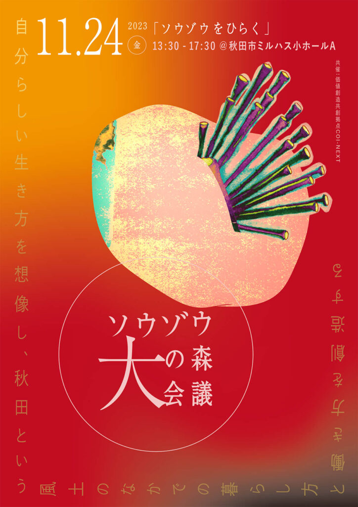 11月24(金)、あきた芸術劇場ミルハスを会場に、これまでのソウゾウの森会議を振り返り、次年度以降の活動目標を生み出すことをテーマに「第1回ソウゾウの森大会議」を開催します。